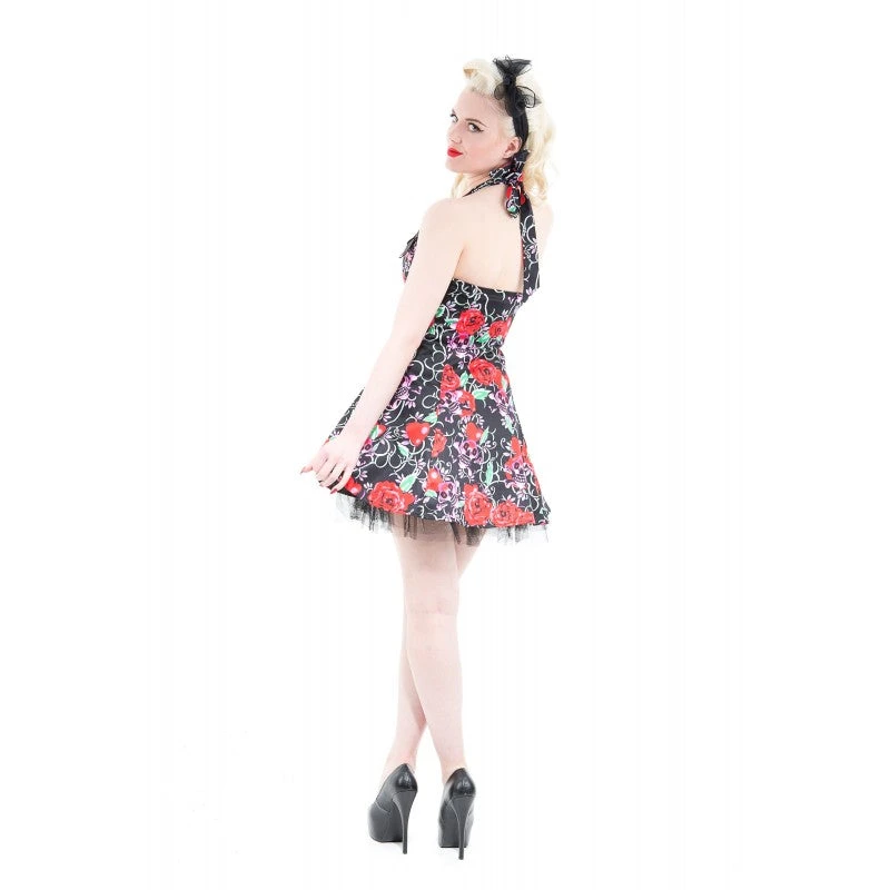 Fabulously flirty pin up style is flattering and sexy! The pattern has purple skulls and red roses on a black background with peekaboo netting underneath. Adjustable halter-neck and bows at the top of the sweetheart neckline give it the sweet touch. Sturdy cotton and short length make it your perfect summer party dress!