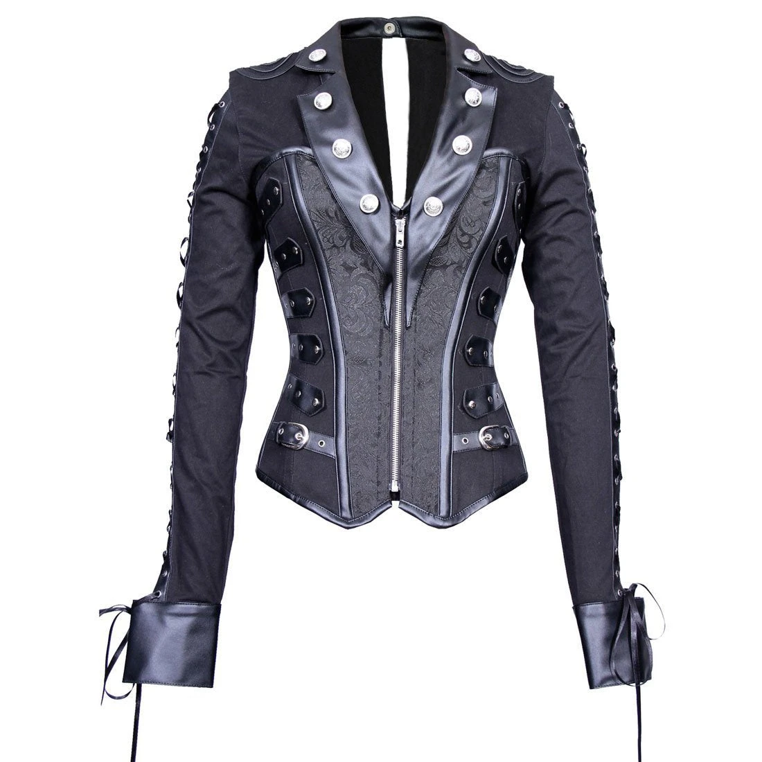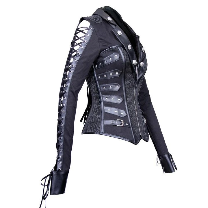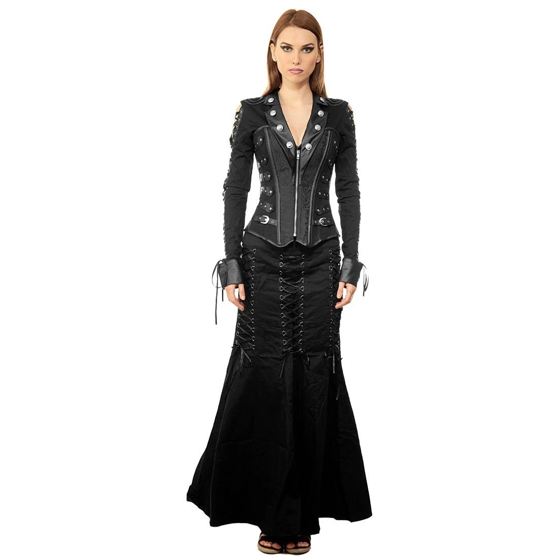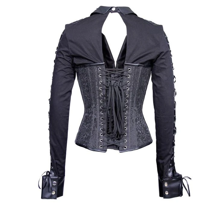 Gothic outfits for women don’t always have to mean Morticia Addams gowns and flowing capes. Let your tough side shine and wear something that makes you feel like the Gothic warrior you are! Channel your inner Death Dealer Selene and enjoy the dangerous aura this beautiful corset will give you! Presenting as a collared shirt with a steel boned overbust corset, this is a top that is as comfortable as it is impressive. Mixing textures through the use of different fabrics, and with silver button details that add a touch of elegance, this corset is one you’ll love to pair with leather pants, an awesome skirt, or anything your imagination can conjure!