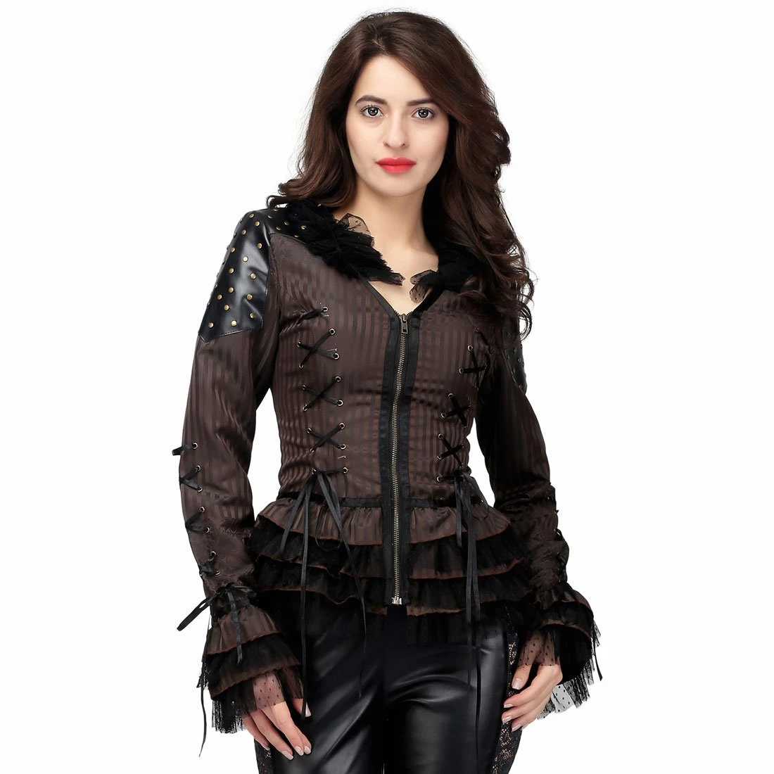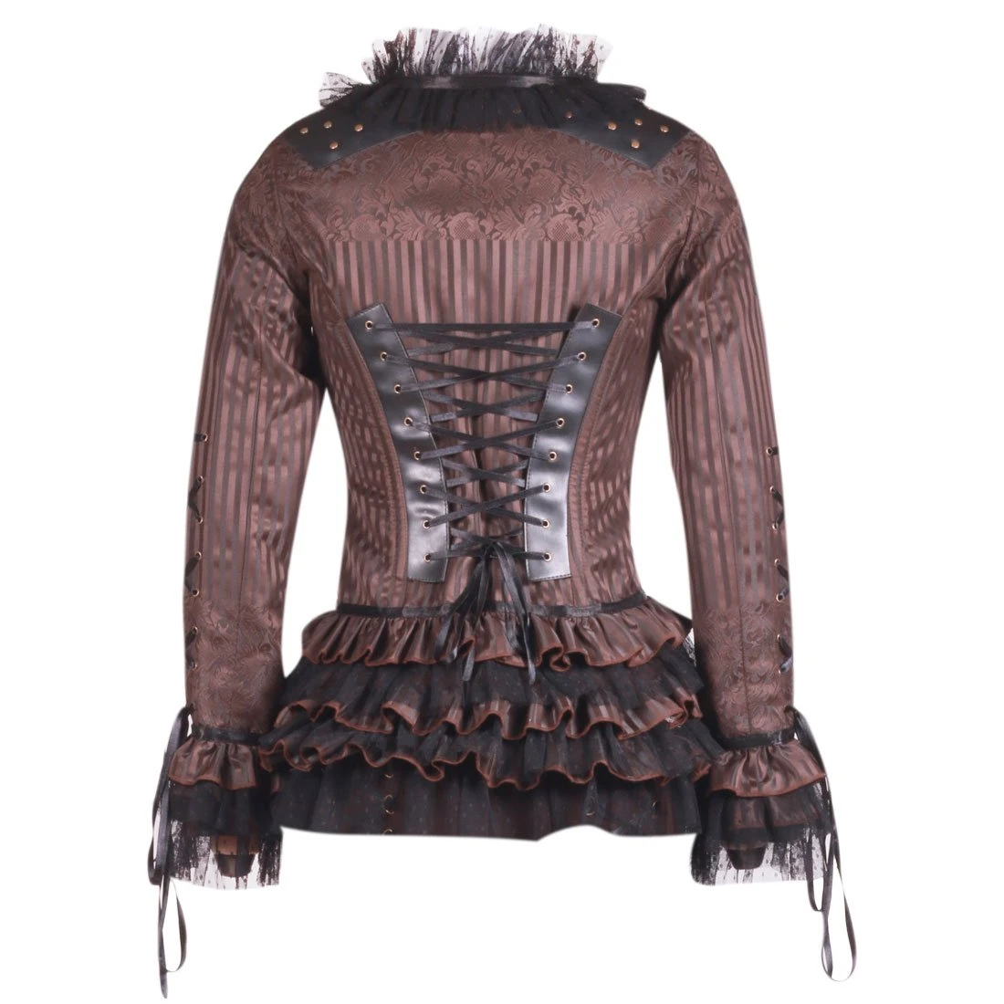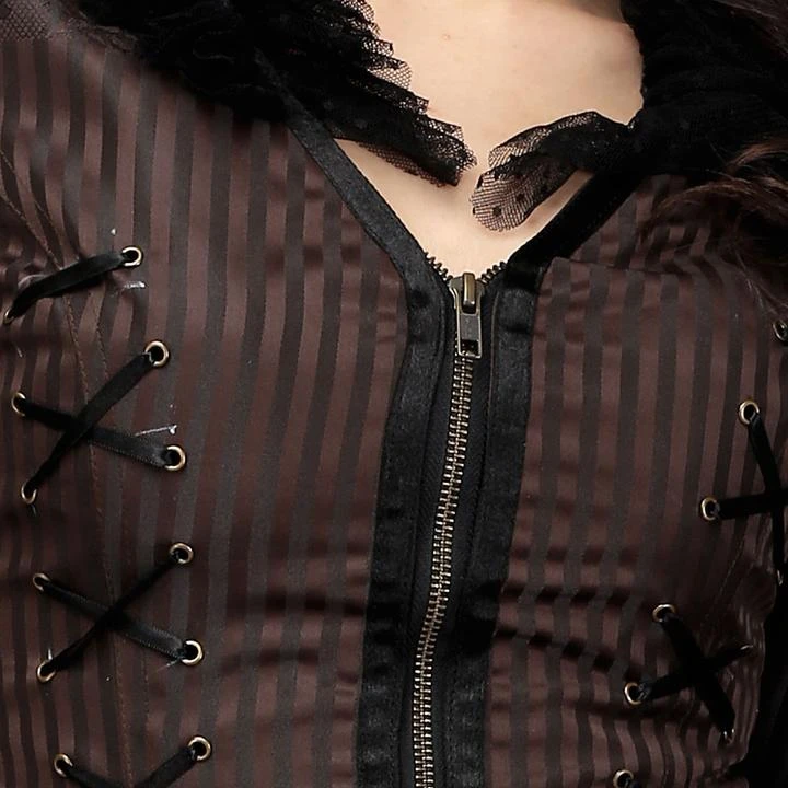 Accentuating your curves with Steampunk flair has never been easier than when you are wearing the Steampunk Duchess top! Easily worn as either a jacket or as a top, this is a piece of Steampunk beauty that you can’t afford to miss! Featuring a variety of fabrics from brown stripe polyester, leather panels, polka dot mesh and a cotton lining, the various textures and patterns of this top create an eye-catching design while the ruffles pair with the lacing and corset details and allow you to accentuate all of your favourite features! Be bold and be confident in a top that is as breathtaking as you are and display your Steampunk dreams in style