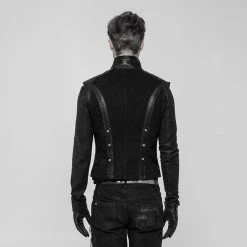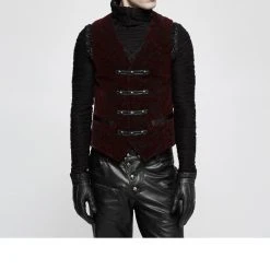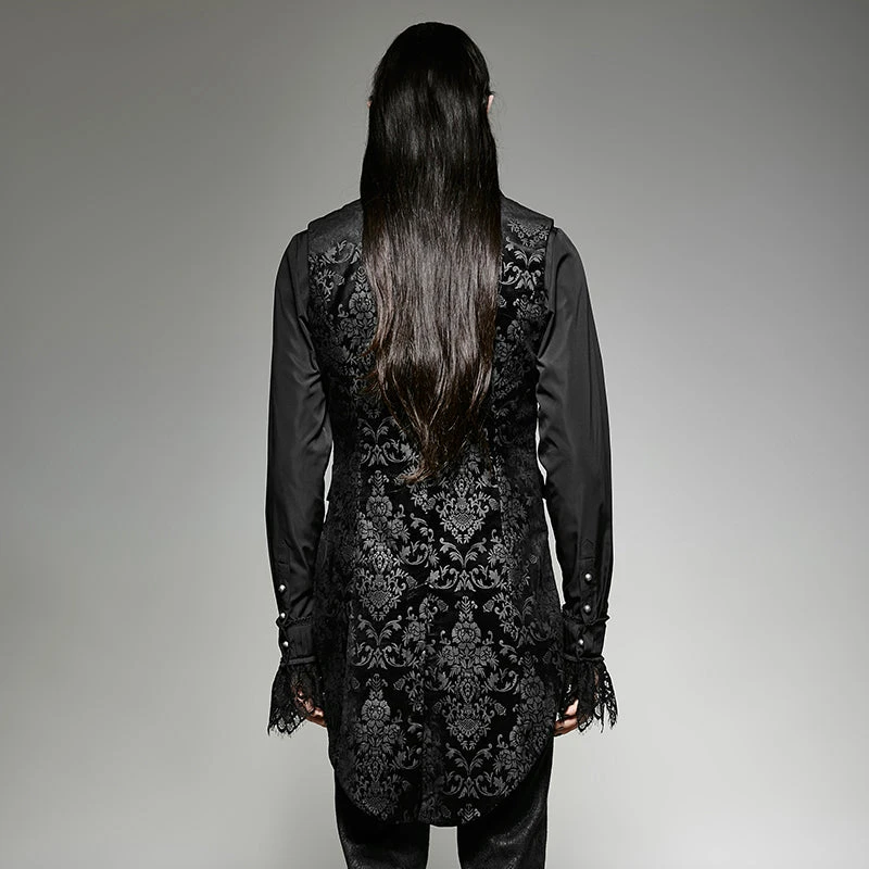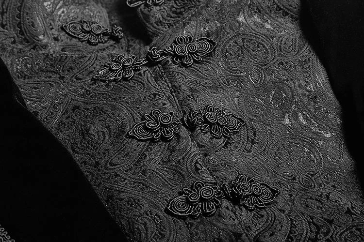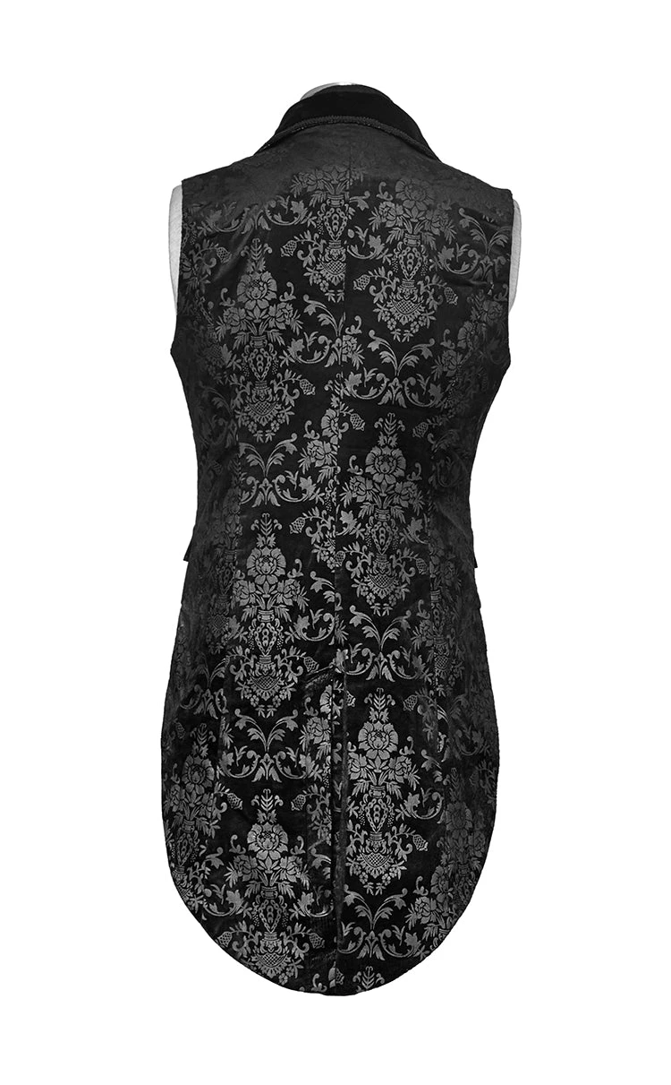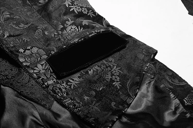 The velvet layer of the 2-layered collar and the velvet trimmings on the 2 front pockets gives this vest a very Gothic look. The brocade and long tuxedo tails makes it scintilla-tingly Steampunk. Oriental knots secure the under vest, which looks like a separate piece, but is all part of the jacket, giving the illusion of an ornate shirt underneath a sleeveless vest.