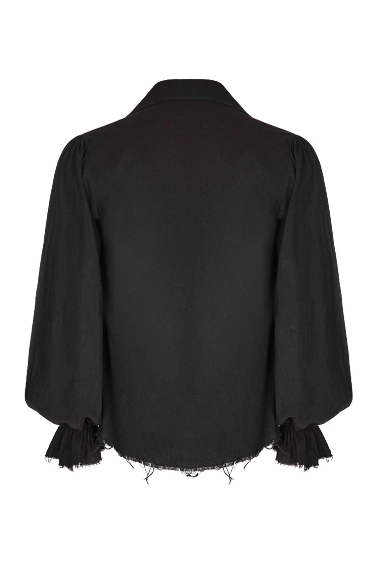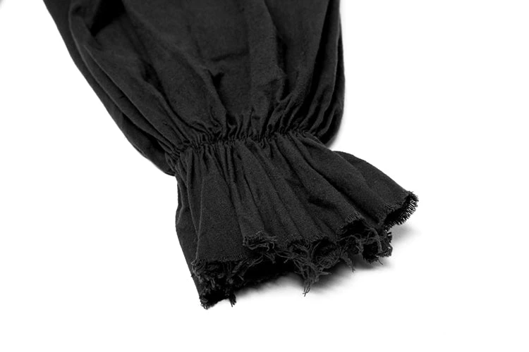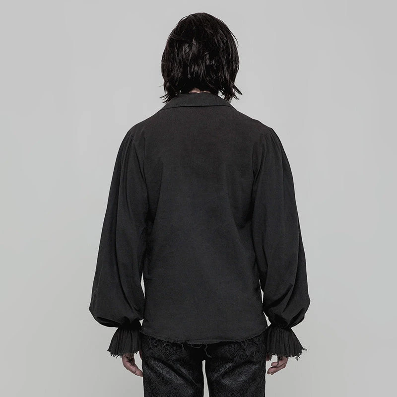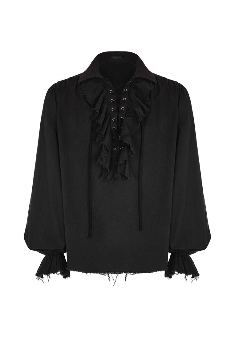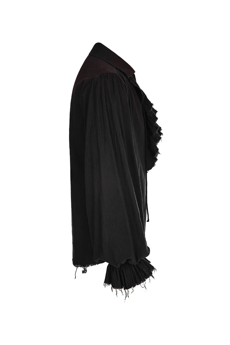 Tightened at the wrist for a bell effect at the end of the sleeve, and featuring a ruffled V-Neck design complete with lacing for tightening, the Orthodox Goth Black Shirt in aged-look black cotton is a versatile shirt sure to suit any of your Victorian Gothic Aristocrat, Gothic, Pirate themed needs.