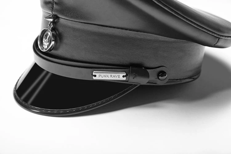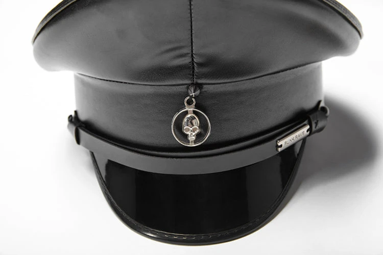 A sturdy and comfortable statement piece, this hat is a mix of gloss and matte synthetic leather in a traditional military style that features a skull charm at the front of the cap to add to the Gothic allure. With its angled top adding dramatic height to your frame and ensuring all eyes are on you, this hat is one that you can incorporate into your Gothic, Post Apocalyptic, Dystopian, Military Goth and Fetish outfits seamlessly for an added touch of authority!