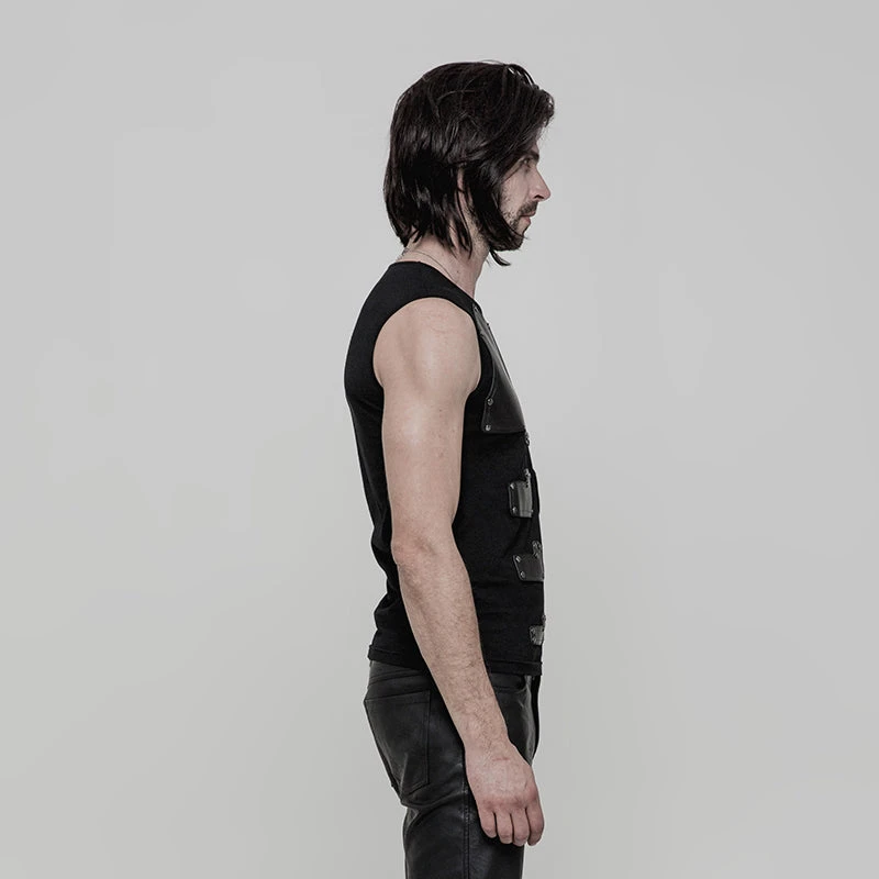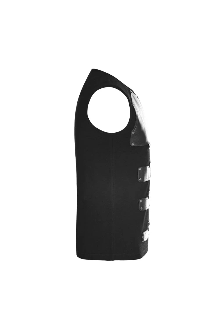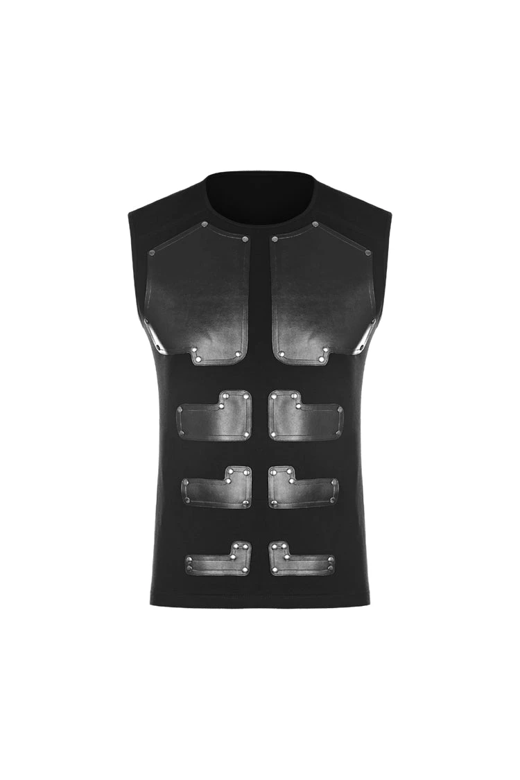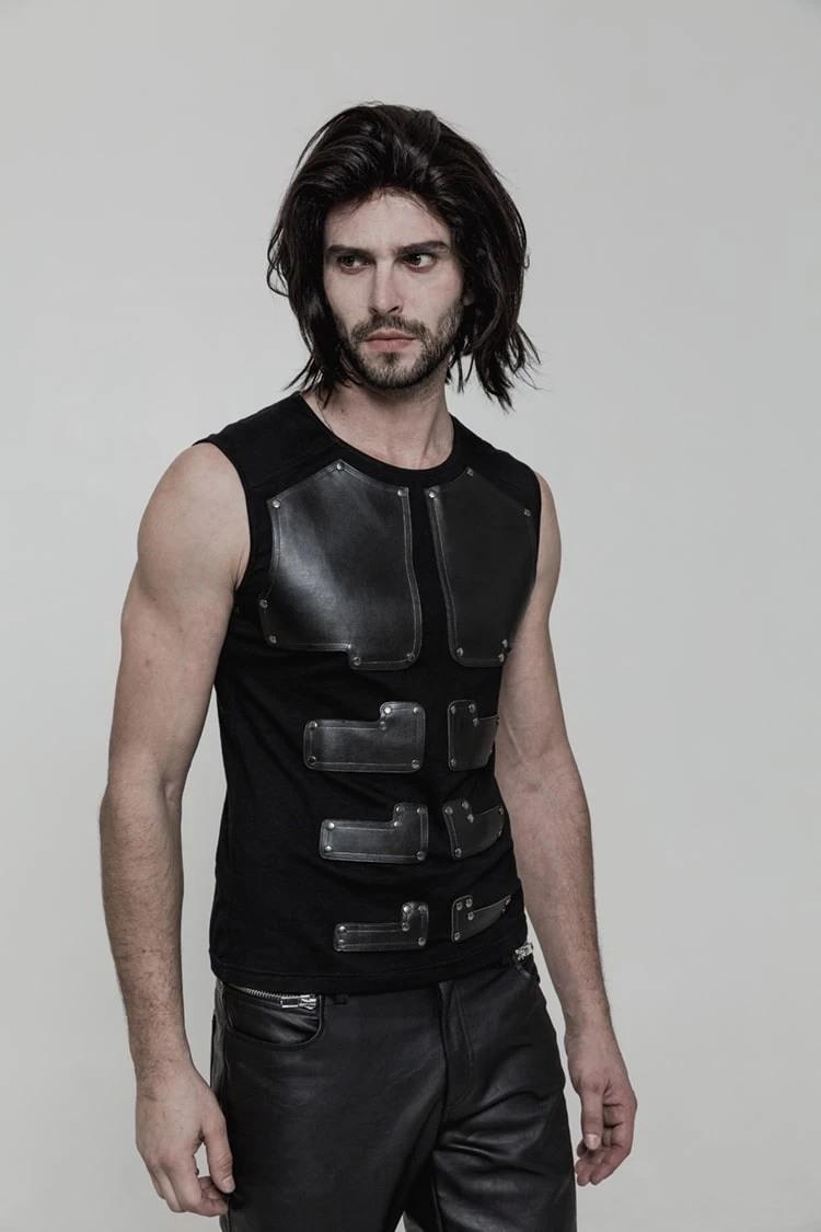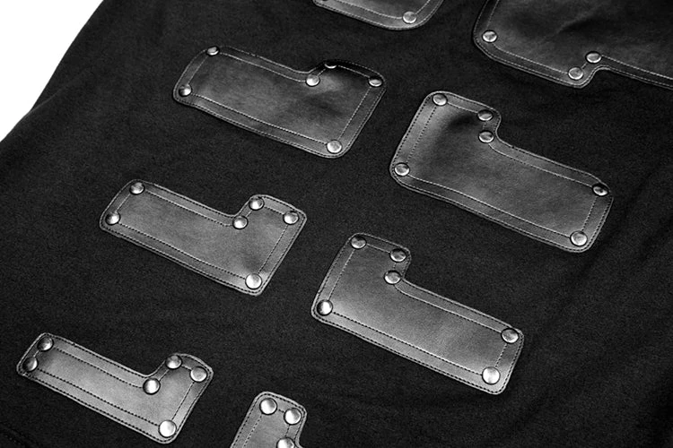 Black stretchy material features eight PU Leather panels that mirror the muscle structure of the male torso, and take a simple black shirt from basic to brilliant. Worn on its own or with a variety of other Punk or Gothic accessories, this is a shirt that can either stand out or blend in but that always adds something special to your look.