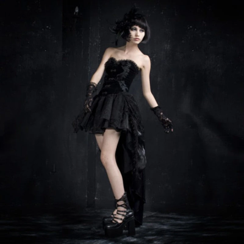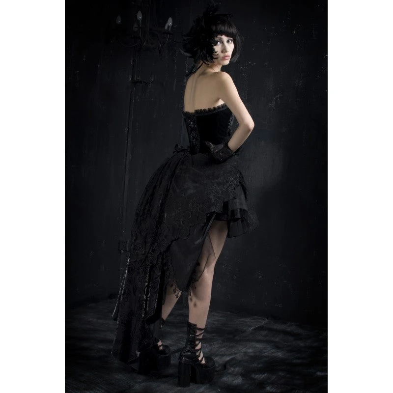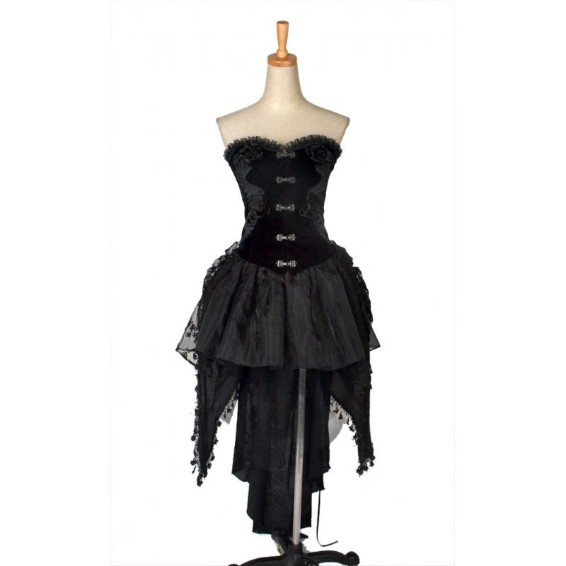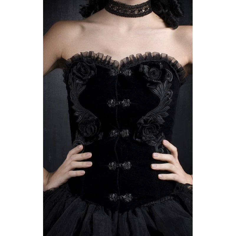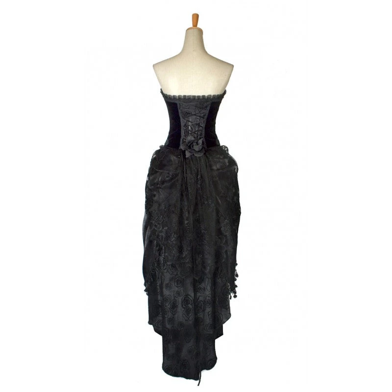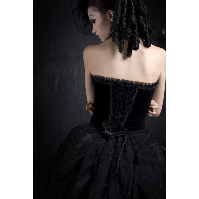 Absolute elegance. This romantic Victorian style dress has a Gothic edge. The luscious velvet bodice can be worn with straps or strapless and is trimmed with ruffles and adorned with flowers and embroidered leaves.