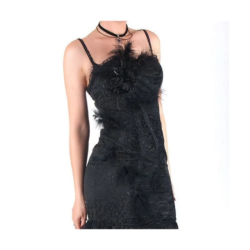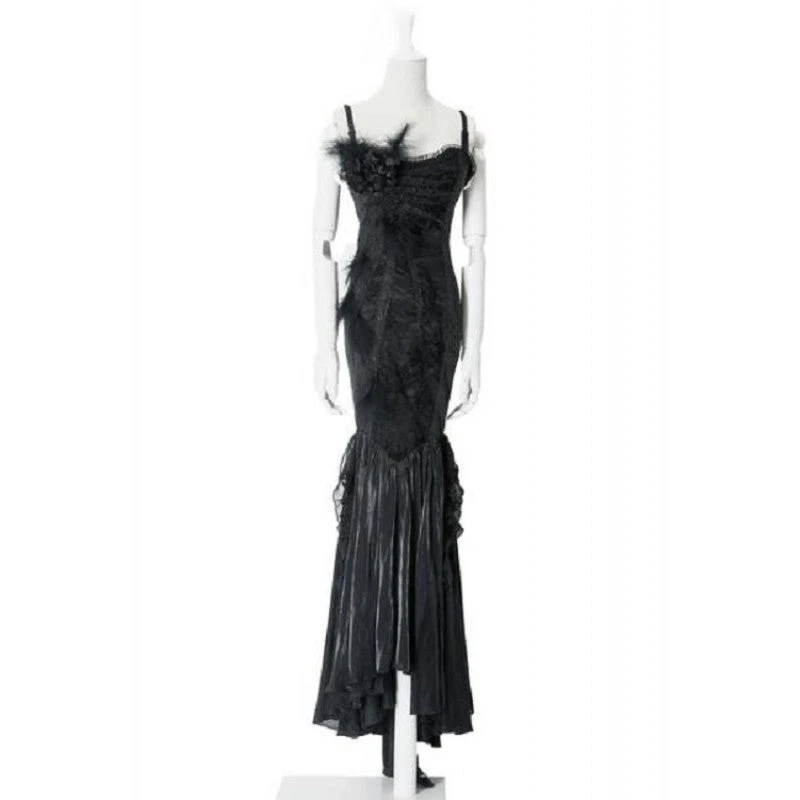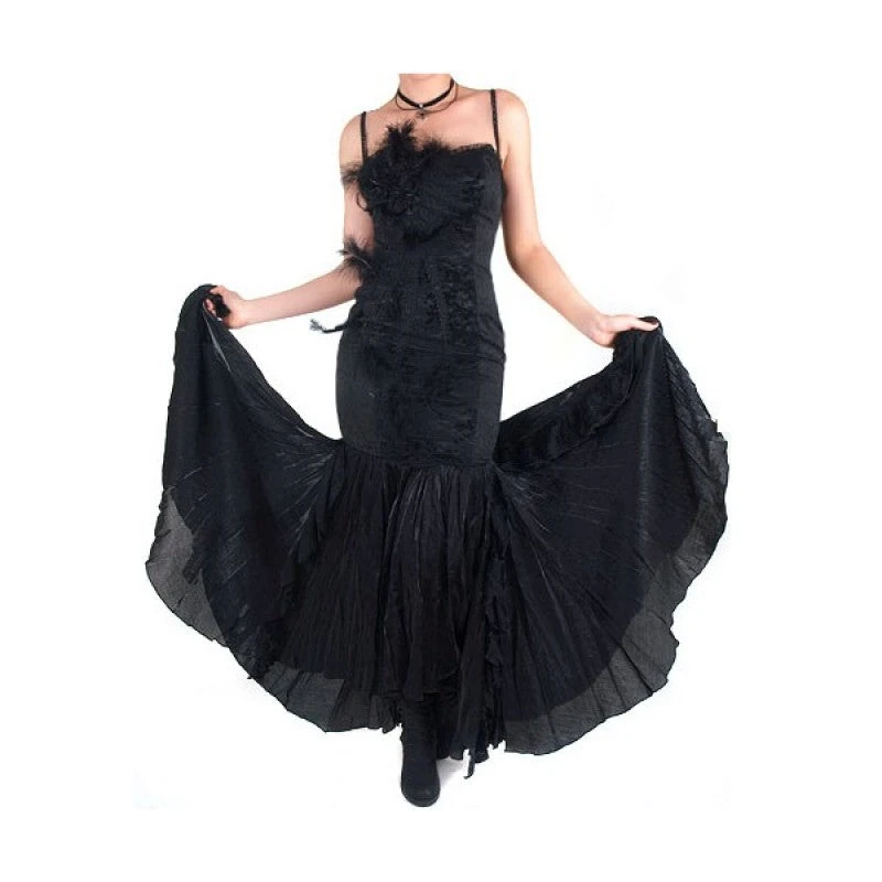 One of our all-time favourites! Steamy sexy, glamourous and beautiful, wear this dress when you want the stunning siren look to match your attitude. Corset-style bodice features a panel of black lace that reaches to the thighs. Feathers and roses adorn the front of the dress and the skirt is layered with lace and shiny nylon to give it a dramatic swish at the bottom. The back laces up corset-style for the perfect fit.