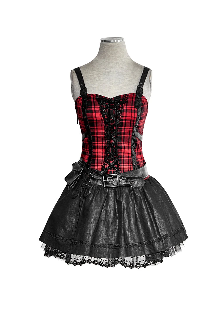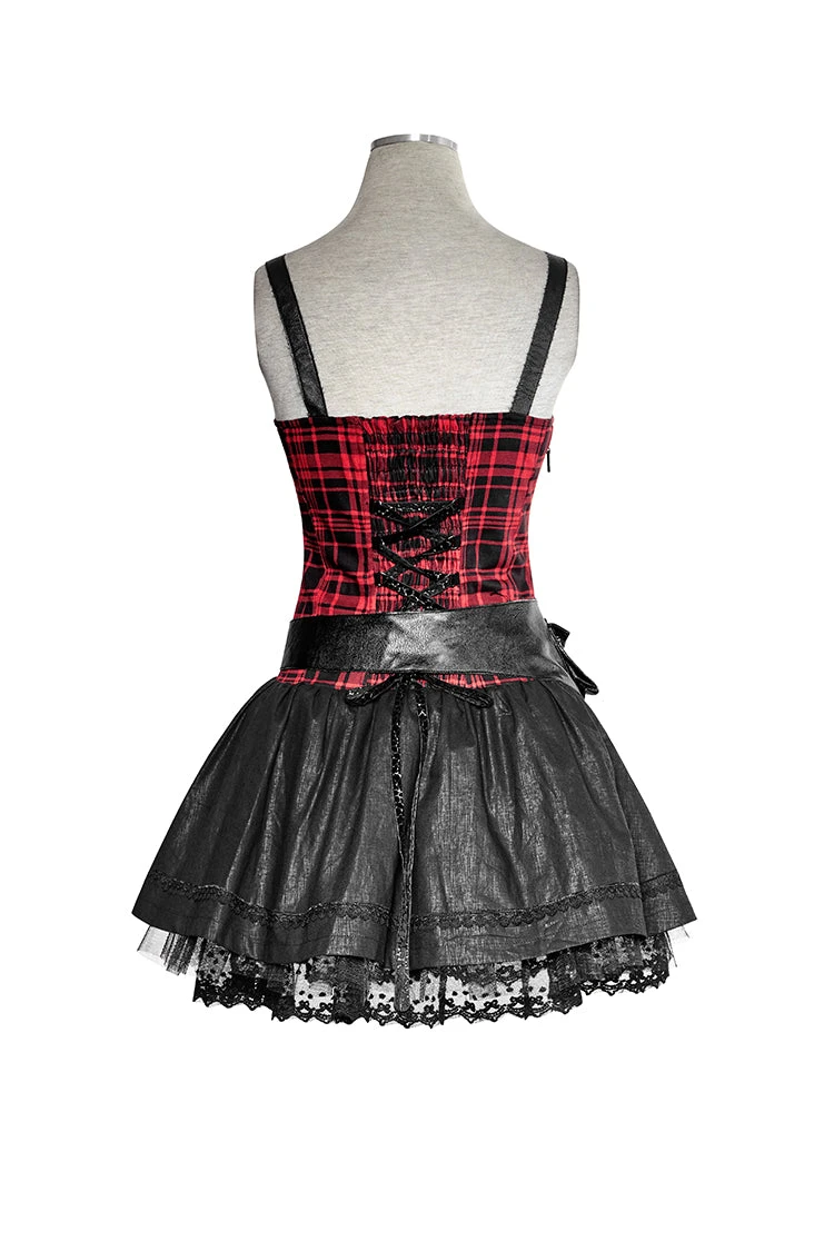 Get your bagpipes blazing in this unique flirty and funky little dress. Its punky plaid design with leatherette buckles makes it perfect for Gothic, Steampunk, or Fetish. The playful skirt with a netting underlay will appeal to all of you cute little Lolitas.