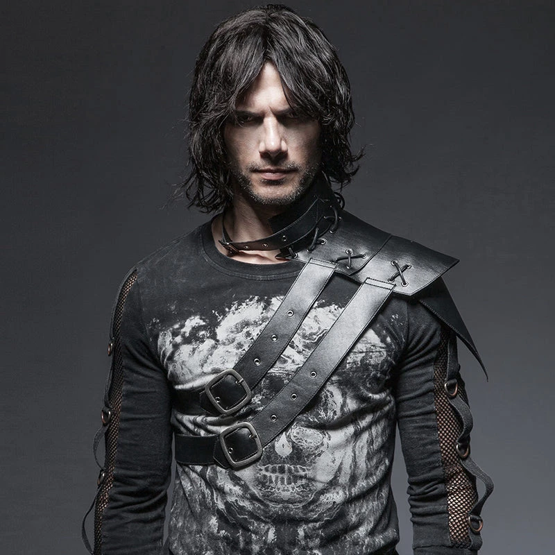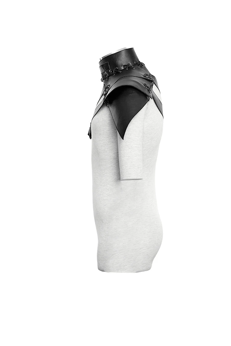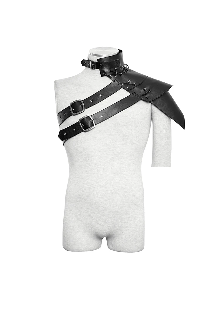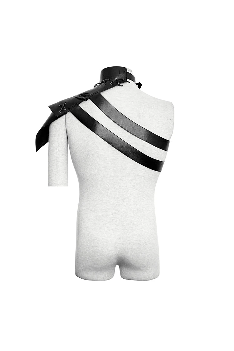 Constructed from double faced PU Leather, the Raider Harness is a sturdy yet comfortable piece that includes a buckle-adjustable stand-up collar and two buckle-fastened chest straps holding the three panels making up the shoulder-covering securely to your body.