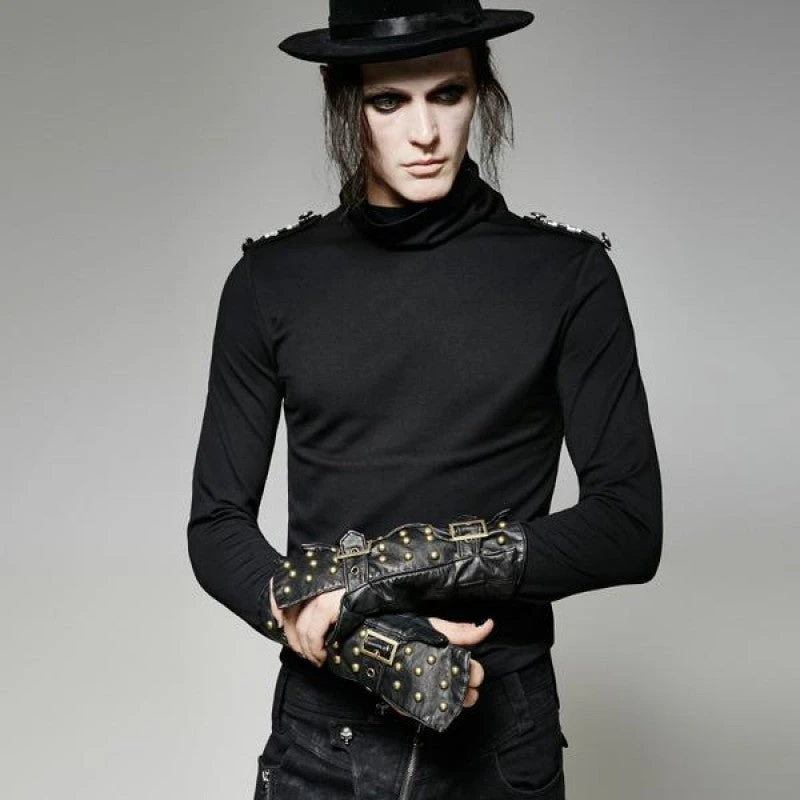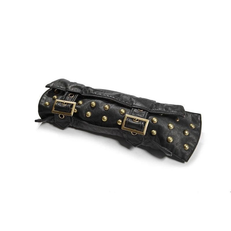 A sturdy sleeve covering the back of your hand up to the middle of your forearm, the Mercenary Armband is constructed of soft, washed PU leather in black with a hint of metallic highlighted by the addition of bronze dome rivets and fastening buckles. With an opening for the thumb to comfortably slip through, the armband is both a comfortable and visually stunning addition to your Gothic, Steampunk or Cosplay wardrobe.