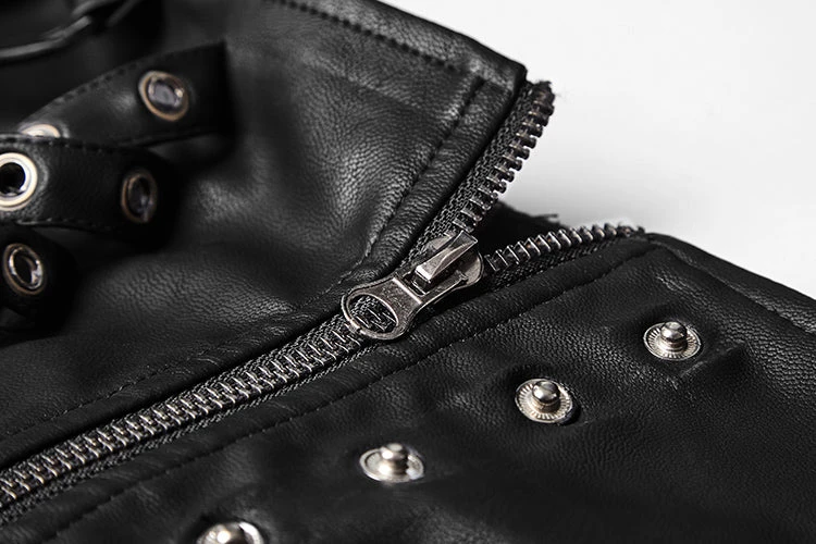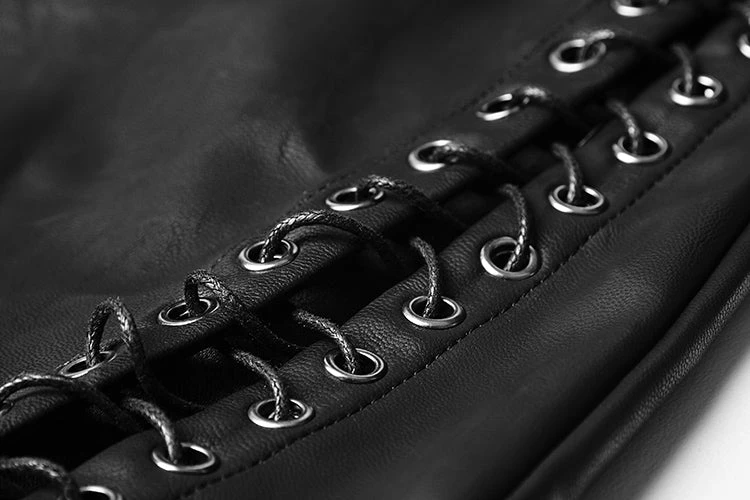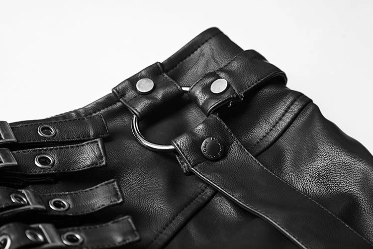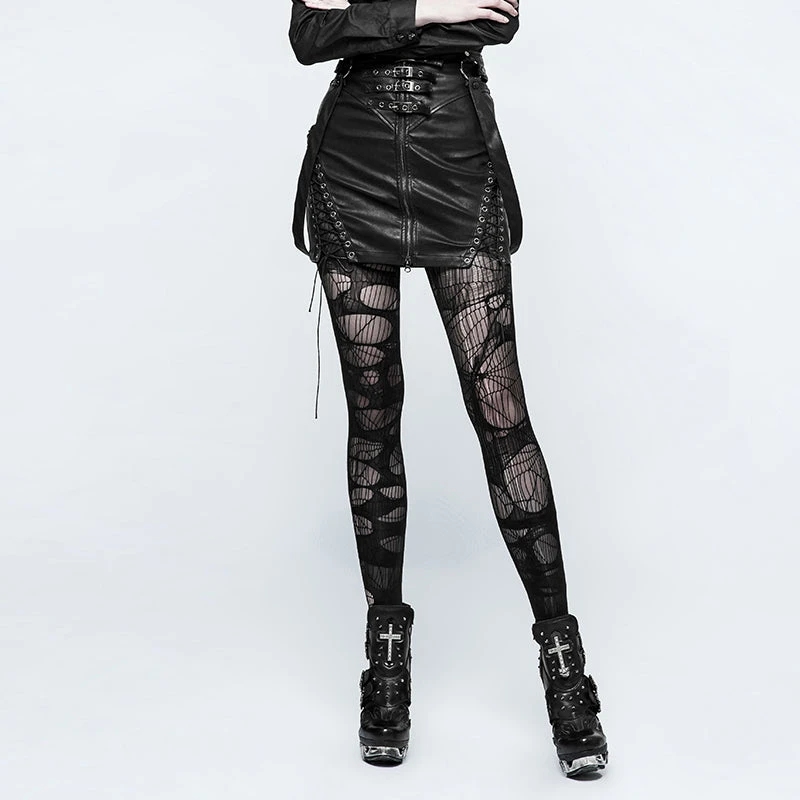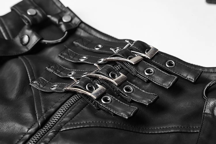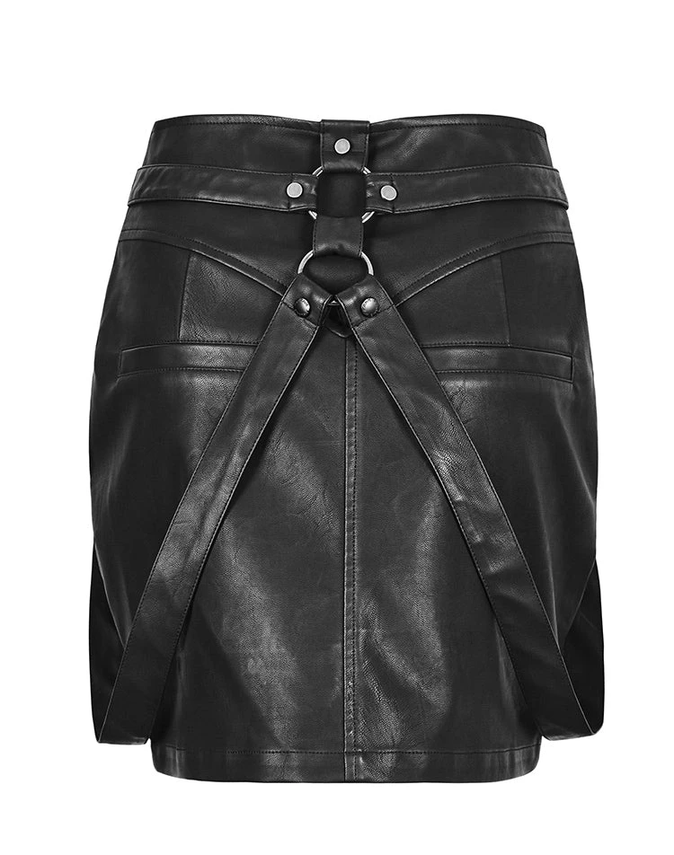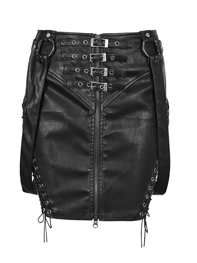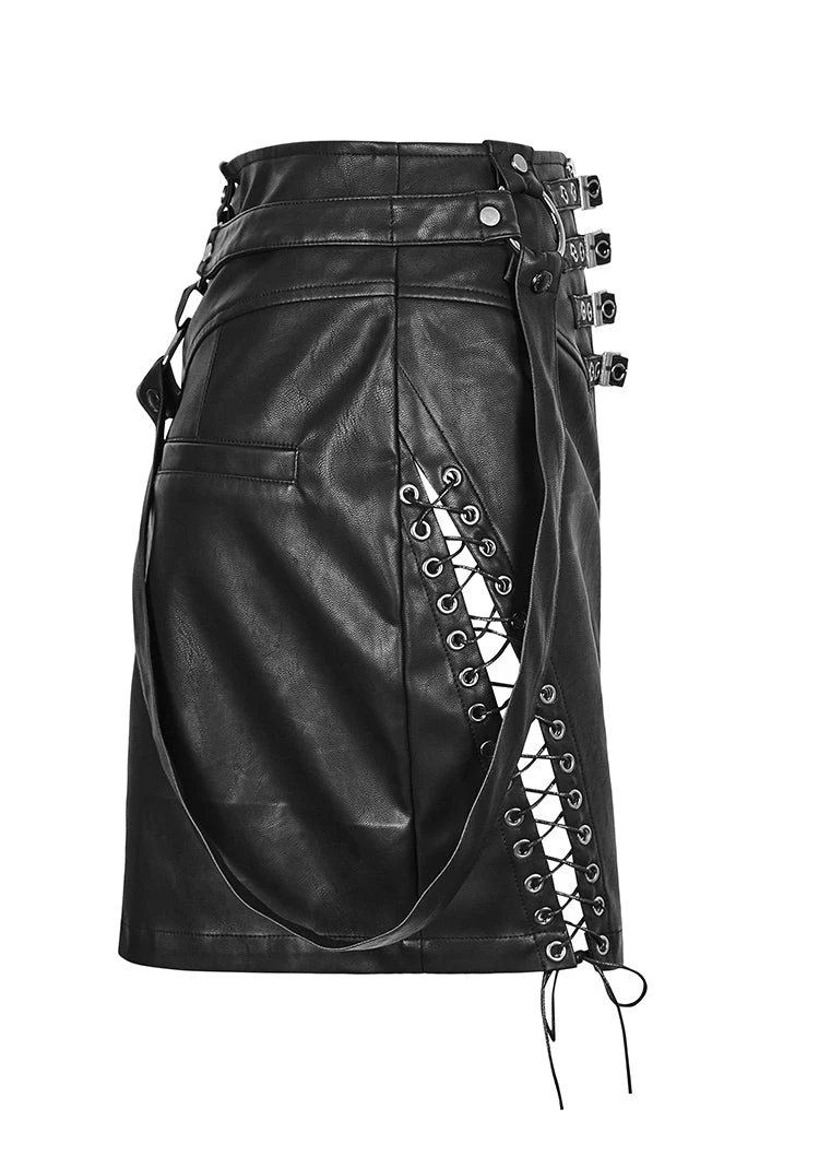 A fetish-inspired skirt with a twist! Suspenders hang down on the sides attaching at the back like a harness. The incredibly sexy skirt zips up the front with leather lace ties on each side exposing just a sliver of your thighs. Four industrial buckles give the skirt a Gothic edge, while two faux pockets in back add a touch of Rocker Chick to its look.