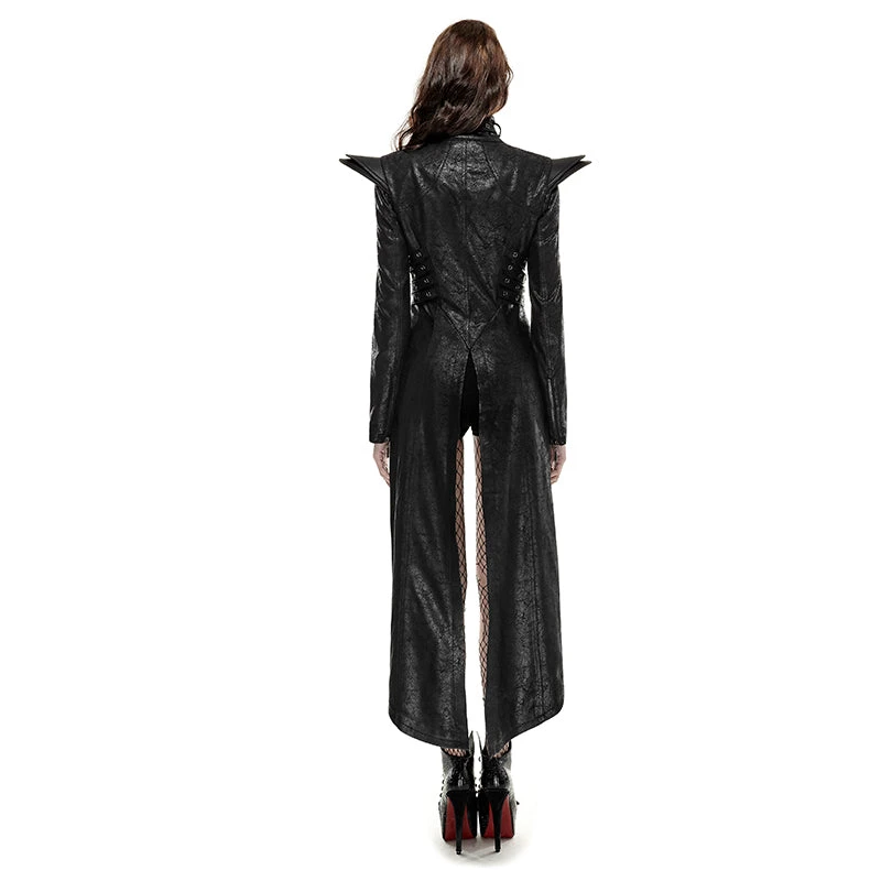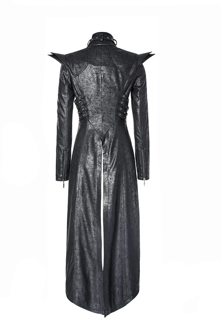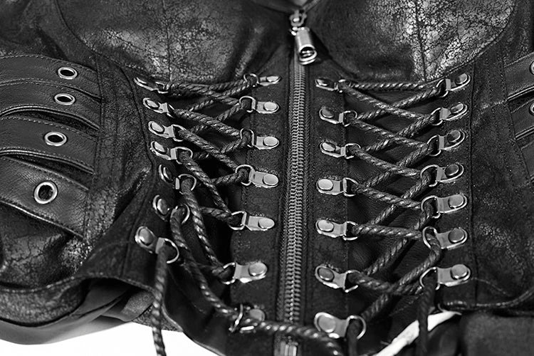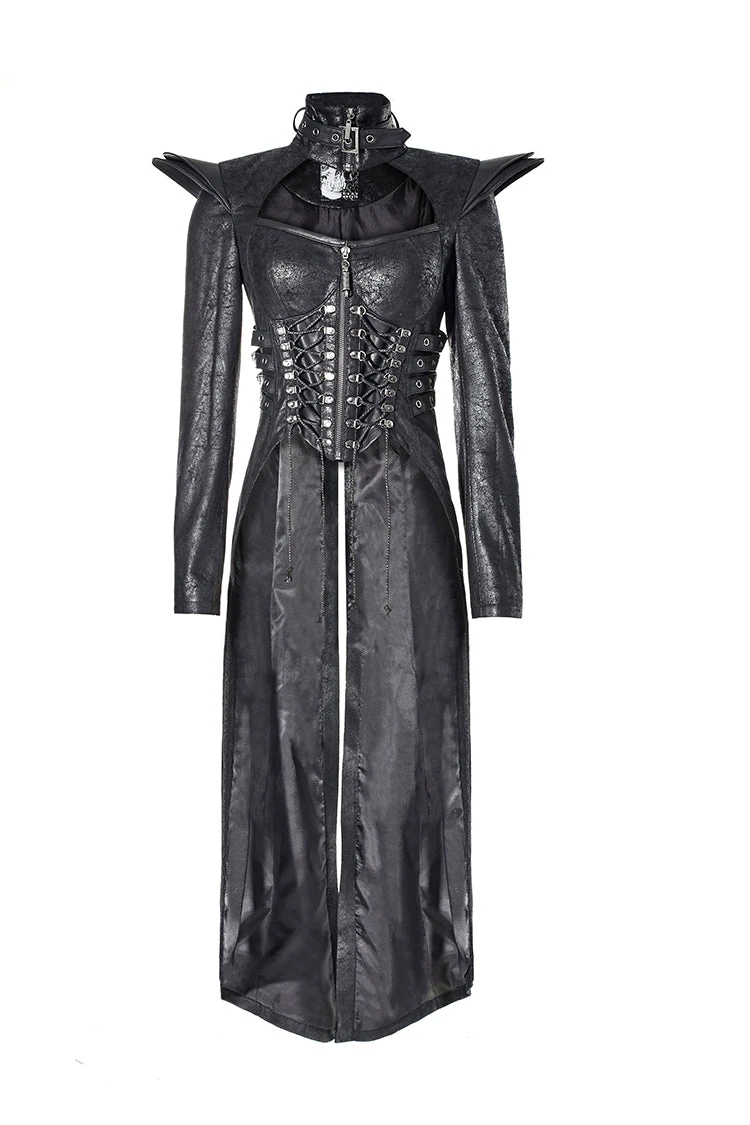 Starting at the top, the buckled and zipped collar snakes its way down to the shoulders that are adorned with 2 layers of leatherette epaulettes. The full length sleeves each have a zipper that opens to a flared wrist.