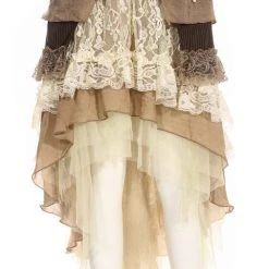 A built-in bra is secured with a front zipper attached to a metal coil zip-pull and adjusted with corset-style ropes. Metal eyelets decorate side straps and full-length panels drape your hips and cascade toward the floor.
